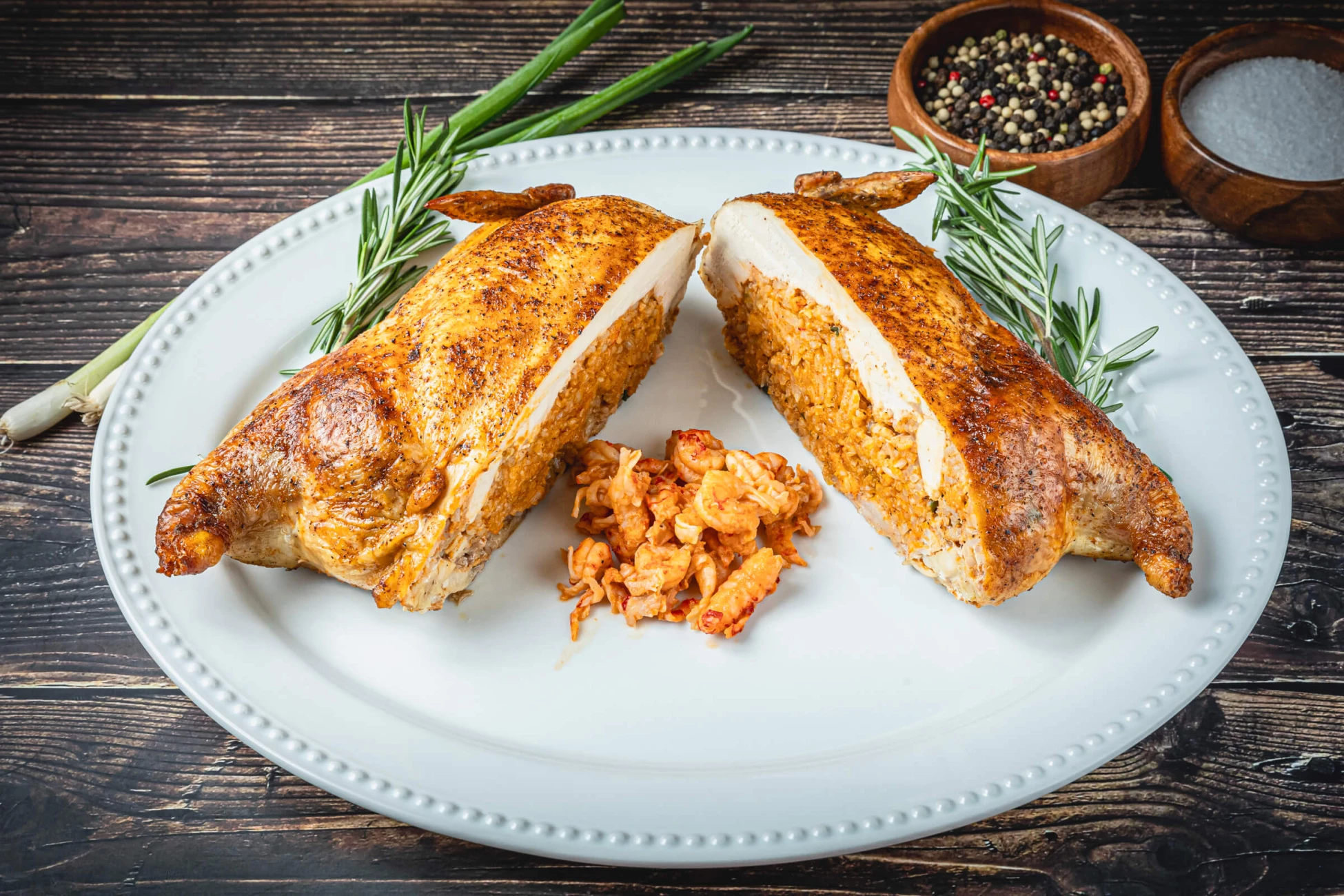 Deboned chickens with our Grandma’s stuffings helped to create La Boucherie. Young tender chickens are carefully deboned by hand and then filled with one of our homemade stuffings. After being stitched back together with butcher twine, the chickens are seasoned to perfection with our special seasoning. They are easy to bake and serve and can be cut into sections like a cake, which creates an impressive presentation.